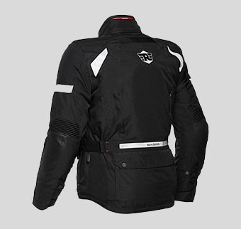 Textile riding jacket with high visibility reflective piping on front and back for the night riding safety.
